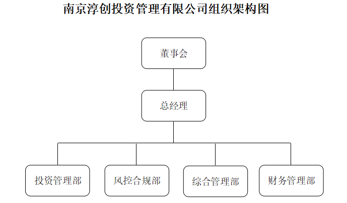 公司設(shè)董事會(huì)負(fù)責(zé)公司重大事項(xiàng)決策管理;設(shè)總經(jīng)理負(fù)責(zé)公司日常經(jīng)營(yíng)及基金運(yùn)營(yíng)管理,下設(shè)投資管理部、風(fēng)控合規(guī)部、綜合管理部、財(cái)務(wù)管理部,目前從業(yè)人員7名。